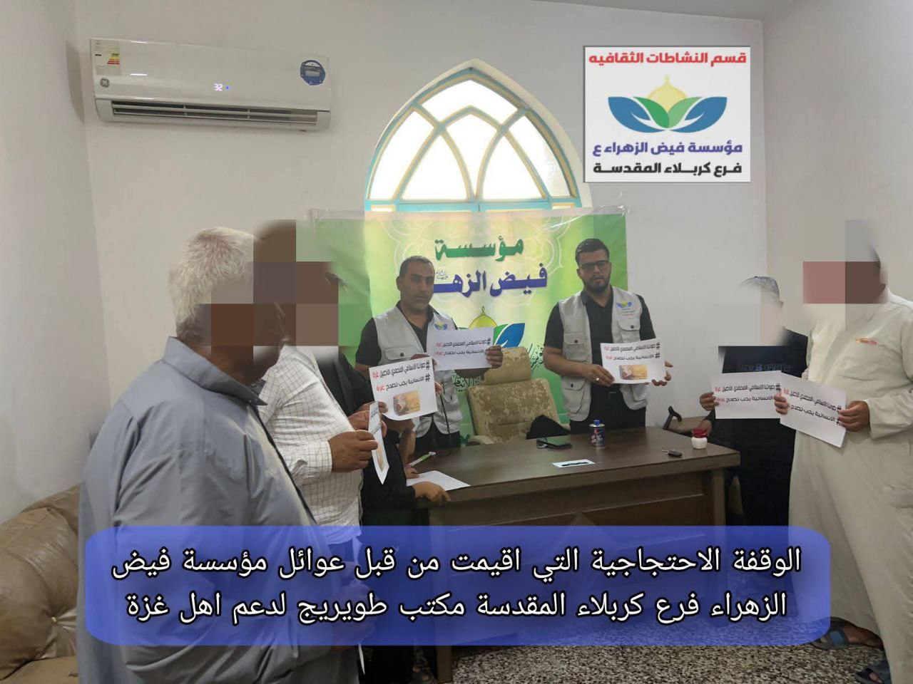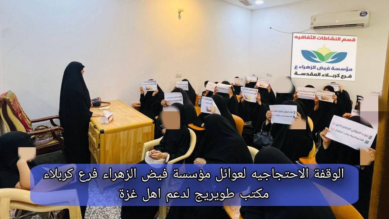وأضاف، أن “الوقفة شهدت حضوراً واسعاً من عوائل المؤسسة، الذين عبّروا عن رفضهم القاطع للظلم الواقع على الشعب الفلسطيني”، مبيّناً أنه “كما حضر الوقفة مدير فرع المؤسسة، ومدير المكتب، ومديرة معهد الزهراء للعلوم الدينية في قضاء طويريج“.