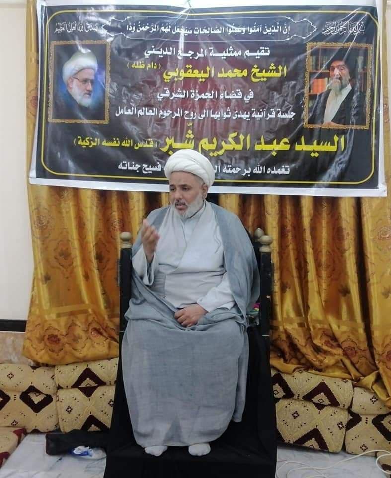 أقامت ممثلية قضاء الحمزة الشرقي لمكتب المرجع اليعقوبي في الديوانية جلسة قرآنية ومجلس عزاء على روح الفقيد العالم العامل معتمد المرجعية في قضاء الدغارة السيد عبد الكريم شبر (قدس سره) توفي اثر مضاعفات فيروس كورونا.