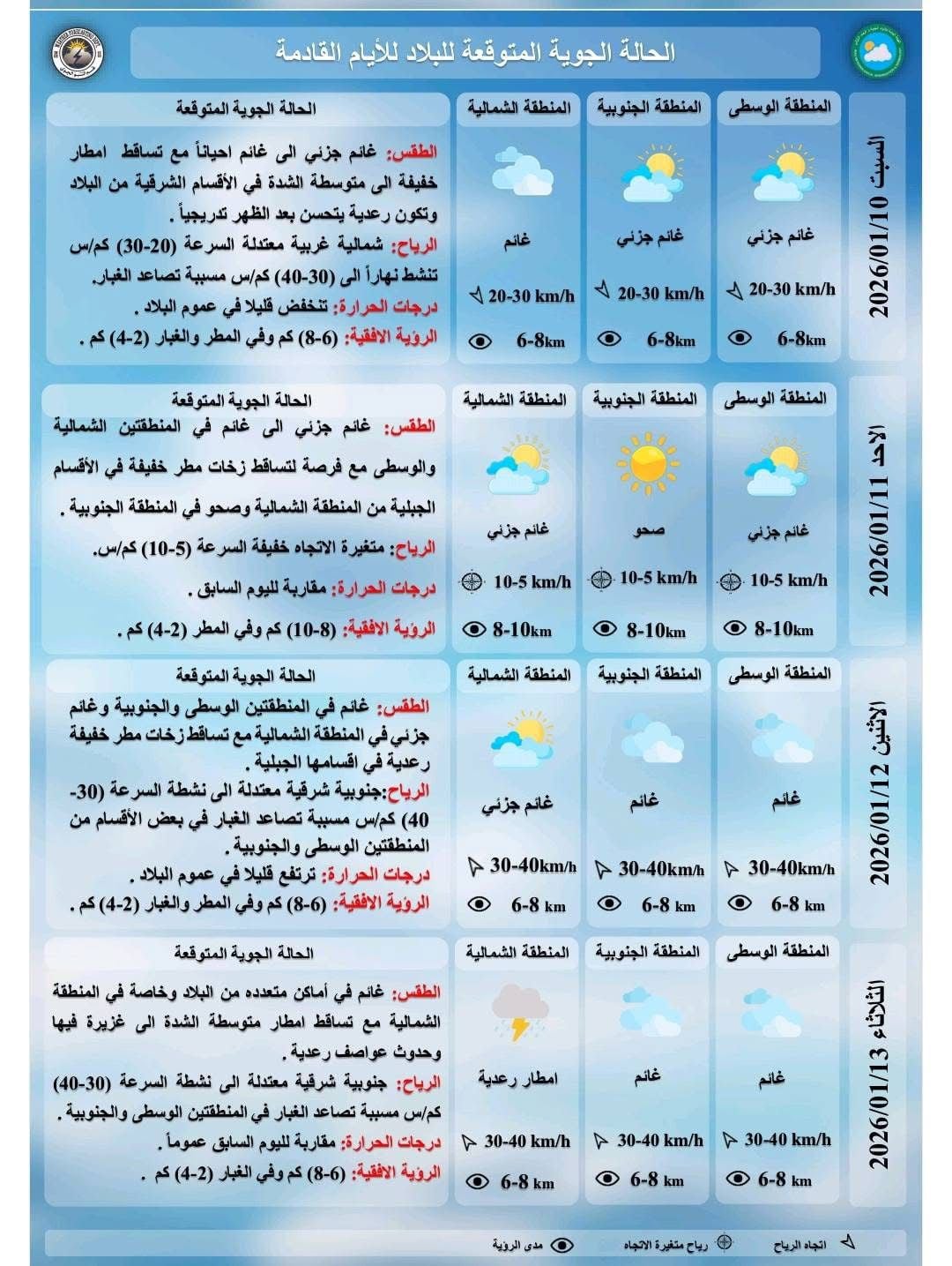وتابعت الهيئة، أن “طقس يوم الاثنين سيكون غائماً في المنطقتين الوسطى والجنوبية، وغائماً جزئياً في المنطقة الشمالية مع تساقط أمطار خفيفة ورعدية في الأقسام الشمالية مع تصاعد الغبار في بعض أقسام المنطقتين الوسطى والجنوبية، ودرجات الحرارة ترتفع قليلاً في عموم البلاد”.