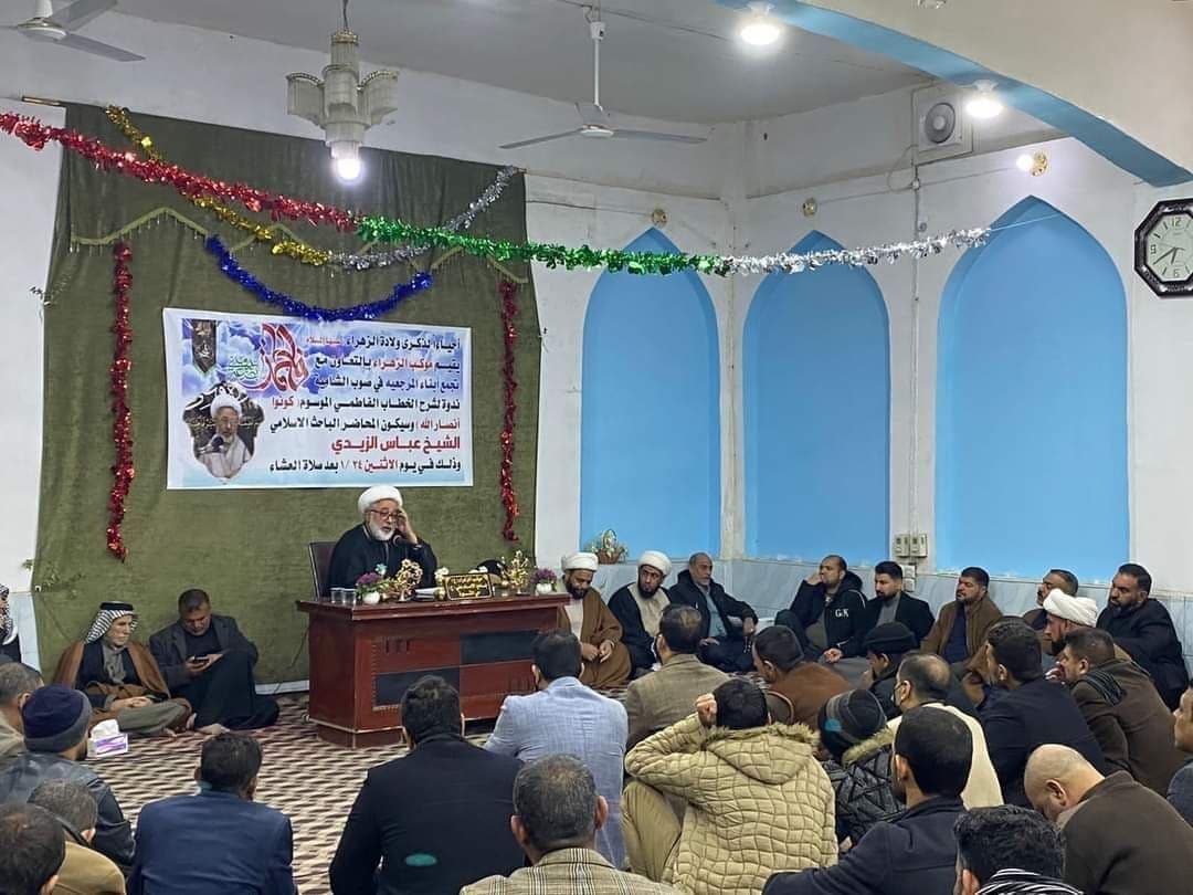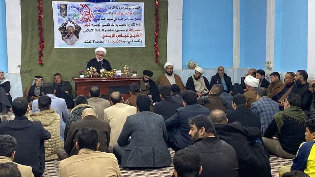 أحيى موكب الزهراء (ع) وبالتعاون مع تجمع أبناء المرجعية صوب الشامية، أمس الثلاثاء، ولادة السيدة فاطمة الزهراء (ع)، بندوة فكرية لشرح مضامين خطاب سماحة المرجع الديني آية الله العظمى الشيخ محمد اليعقوبي (دام ظله)، الموسوم بعنوان “كونوا أنصار الله”.