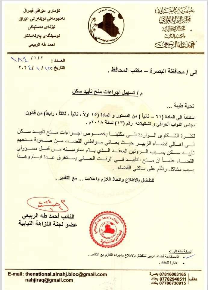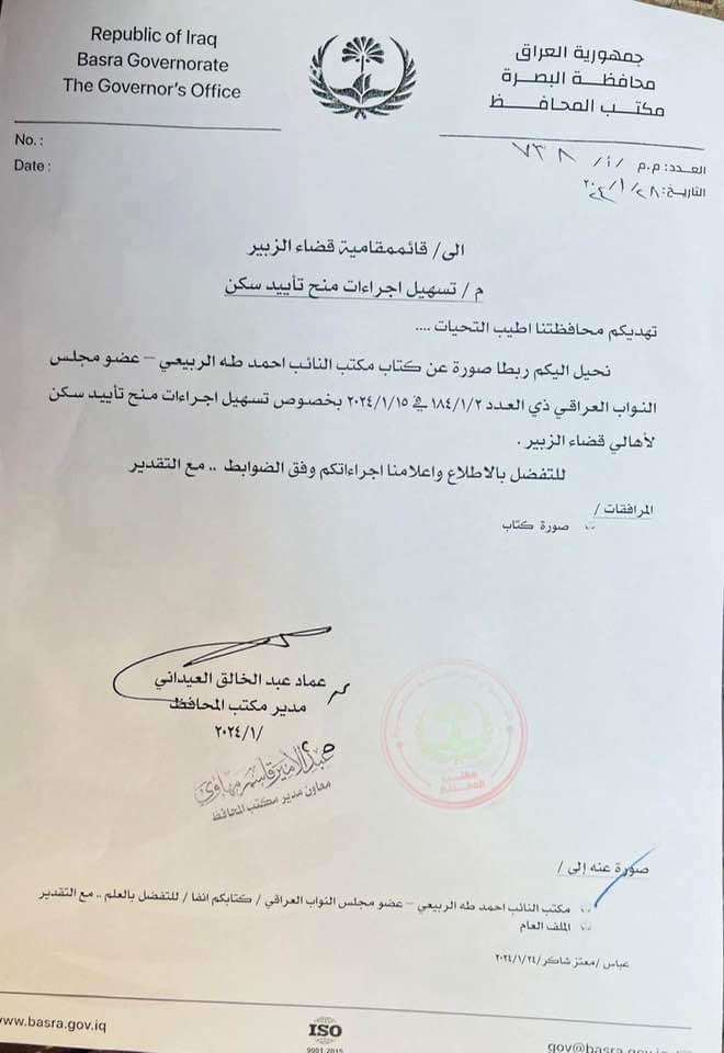 نائب يخاطب ديوان محافظة البصرة لتسهيل إجراءات منح تأييد سكن إلى أهالي الزبير (الوثائق)