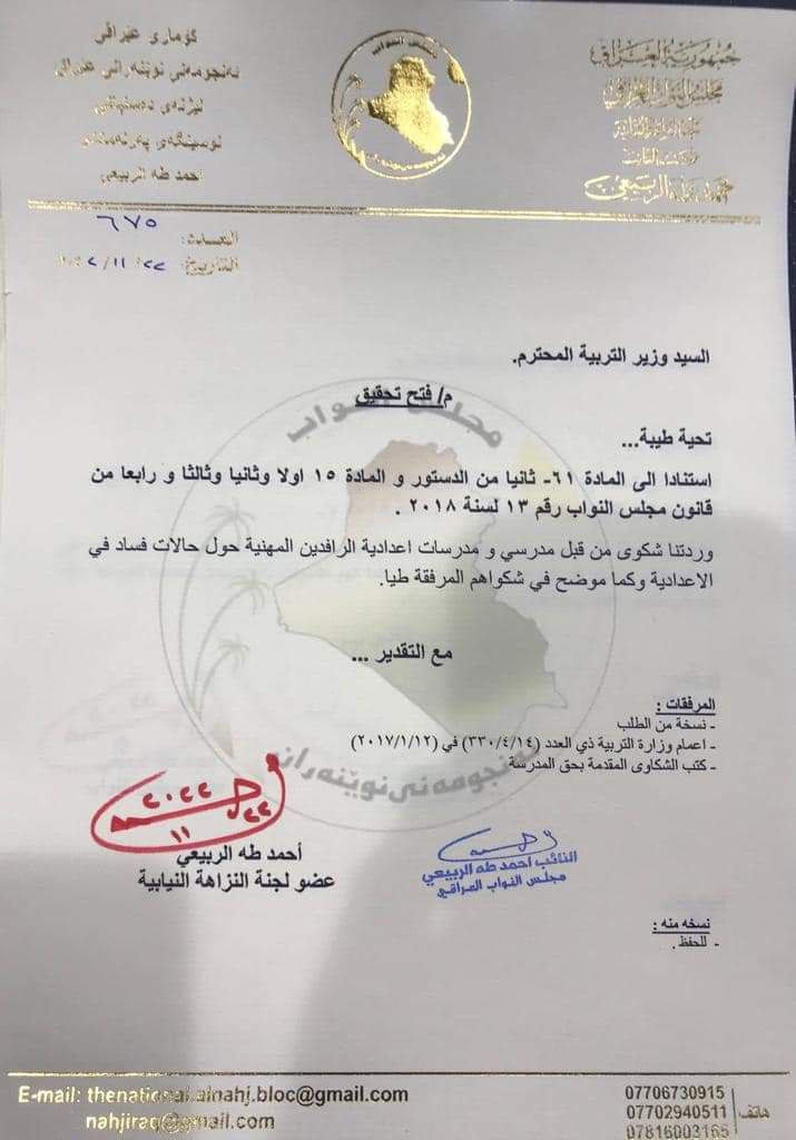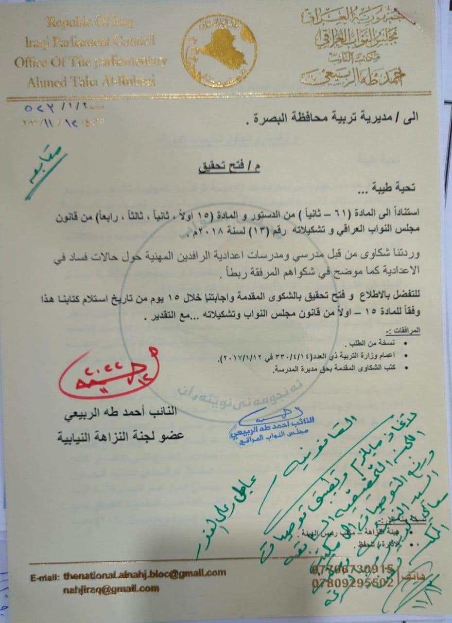 وأضاف الربيعي، “واستمراراً للمتابعة، فإننا نطالب المديرية العامة للتعليم المهني والإشراف المهني بإجراء تقييم حقيقي لجميع إدارات المدارس المهنية بمحافظة البصرة، نتيجة لتصاعد المطالبات بإعفاء إدارات المدارس المهنية غير الكفوءة”.