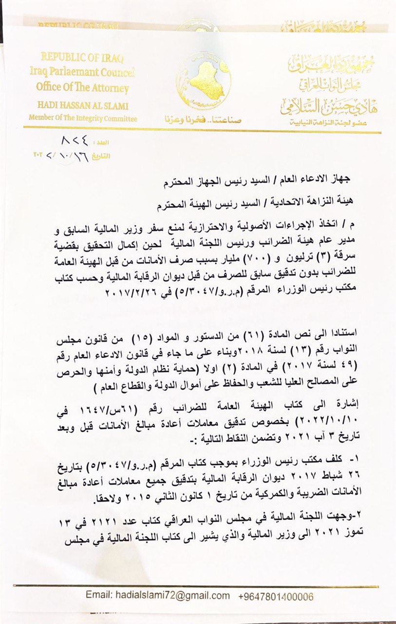 وقال السلامي، في بيان تلقت “النعيم نيوز” نسخة منه، إنه تمت “إحالة ملف الفساد (3) ترليون و(700) مليار إلى هيئة النزاهة الاتحادية وجهاز الإدعاء العام ومحاكم تحقيق النزاهة”، مضيفاً “بسبب الصرف من قبل الهيئة العامة للضرائب دون تدقيق سابق من قبل ديوان الرقابة المالية“.