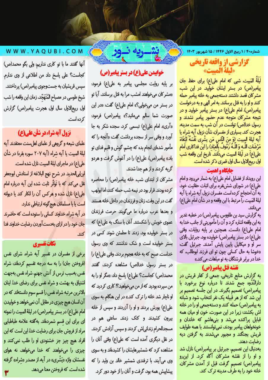 وأكمل البيان، أن “الصفحة الثالثة من هذا العدد تتضمن مقالاً بعنوان (تقرير حول الحادثة التاريخية ليلة المبيت)، التي وقعت في أول ربيع الأول للسنة الأولی الهجرية، ويُسلط الضوء فيها على مكانتها وأهميتها، ومخطط اغتيال النبي (صلى الله عليه وآله)، ونوم علي (عليه السلام) في فراش النبي (صلى الله عليه وآله)، ونزول آية الشراء في شأن علي (عليه السلام) ونقاط التفسير المرتبطة بها”.