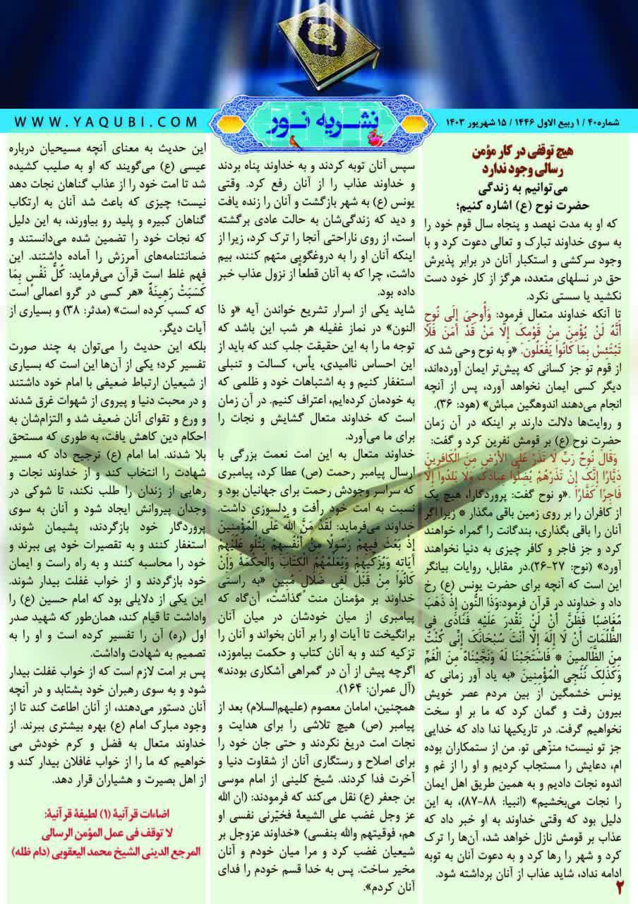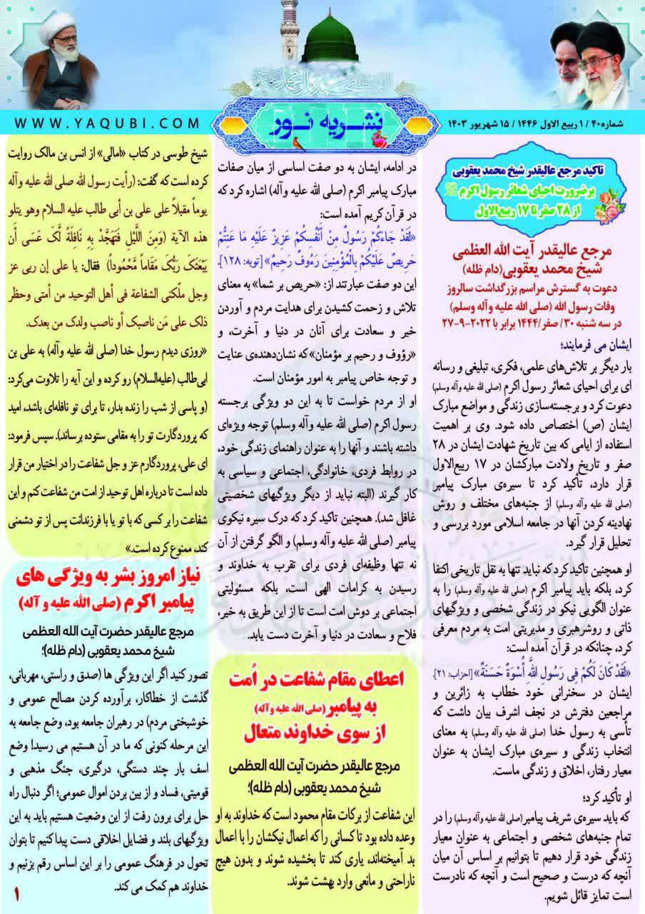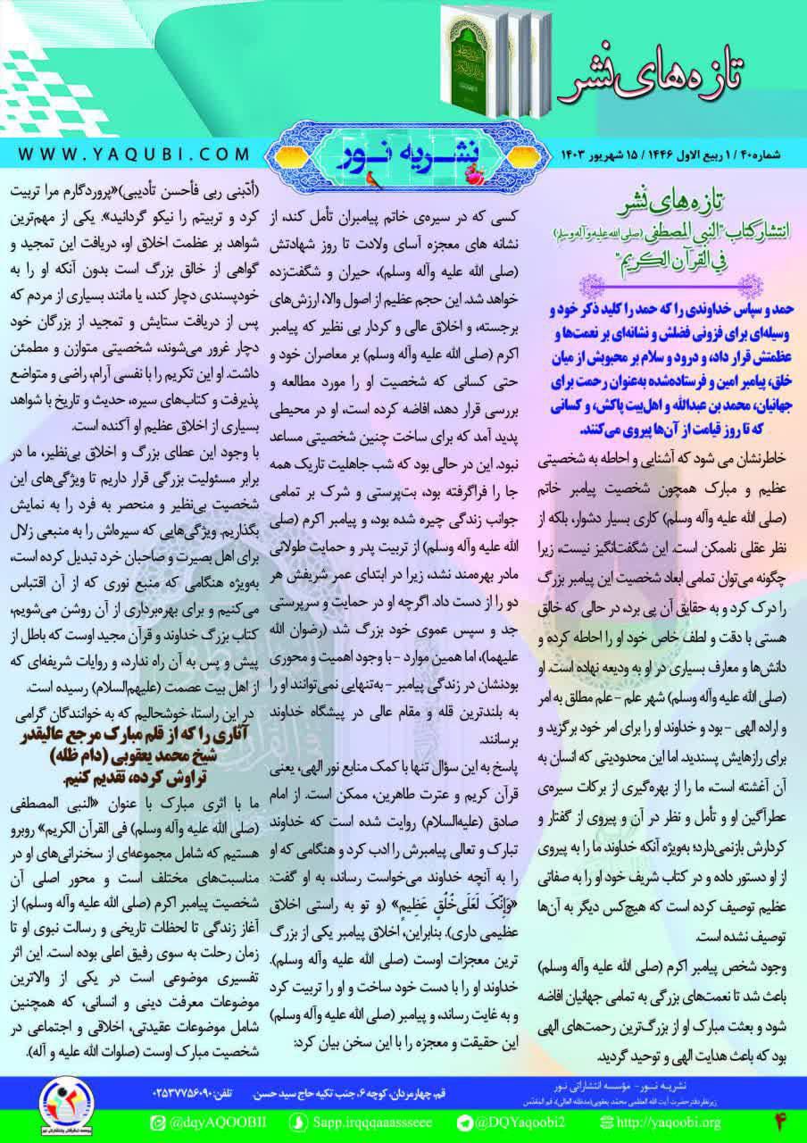 وذكر بيان للمؤسسة، تلقت “النعيم نيوز” نسخة منه، أن “نشرة نور، تهدف إلى نشر أفكار سماحة المرجع الديني الشيخ محمد اليعقوبي (حفظه الله)، وأخبار مكتبه في مدينة قم المقدسة باللغة الفارسية”.