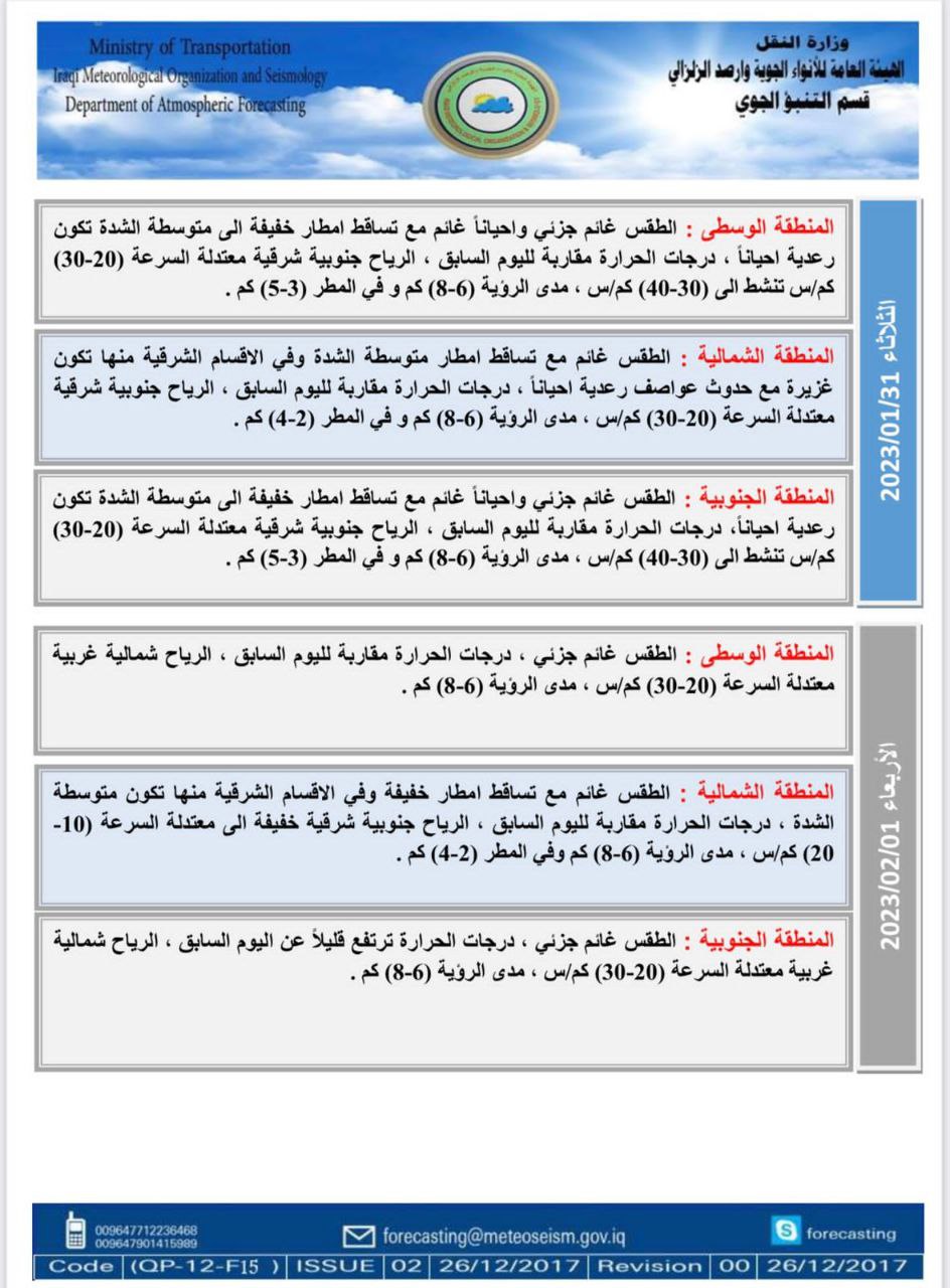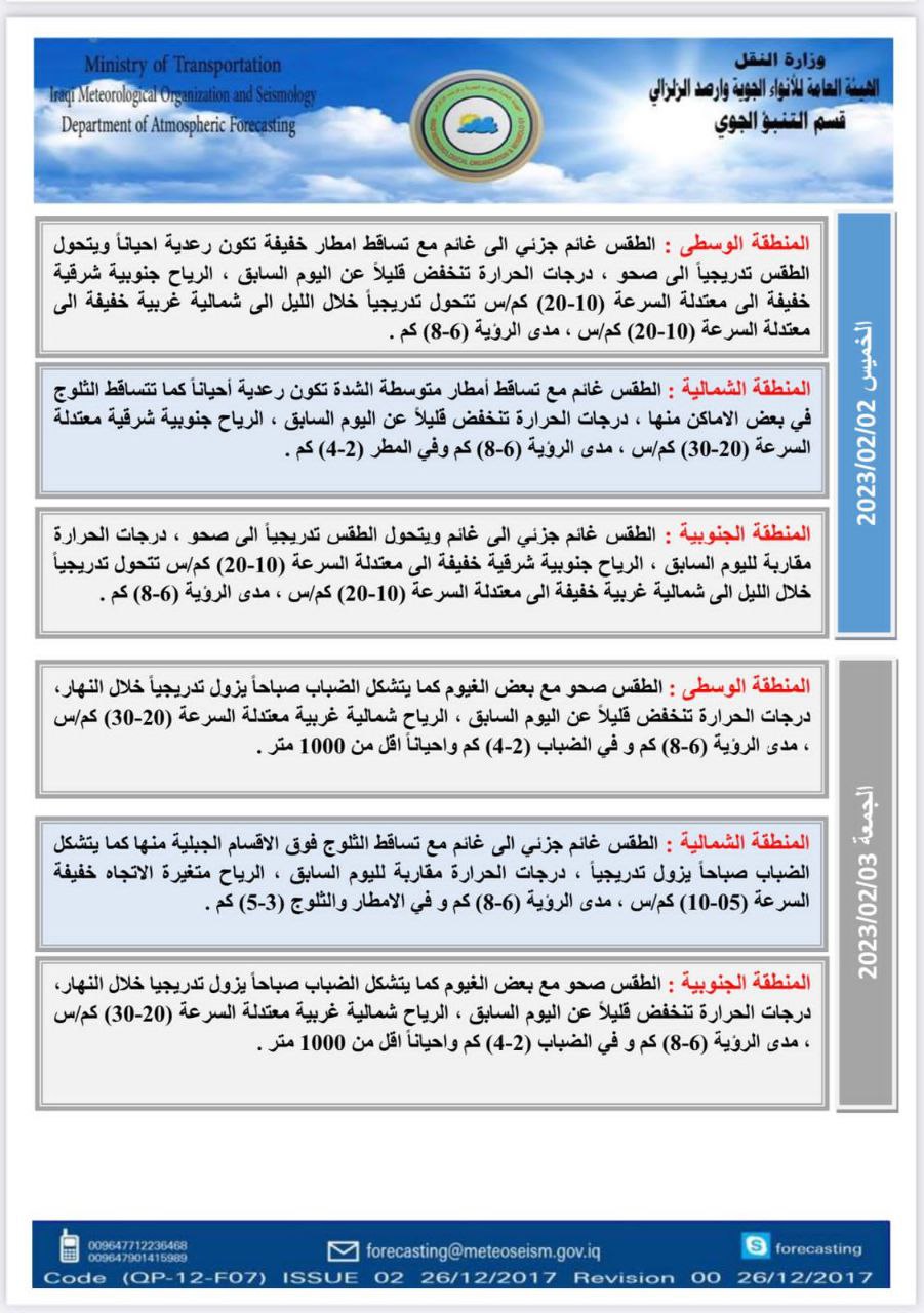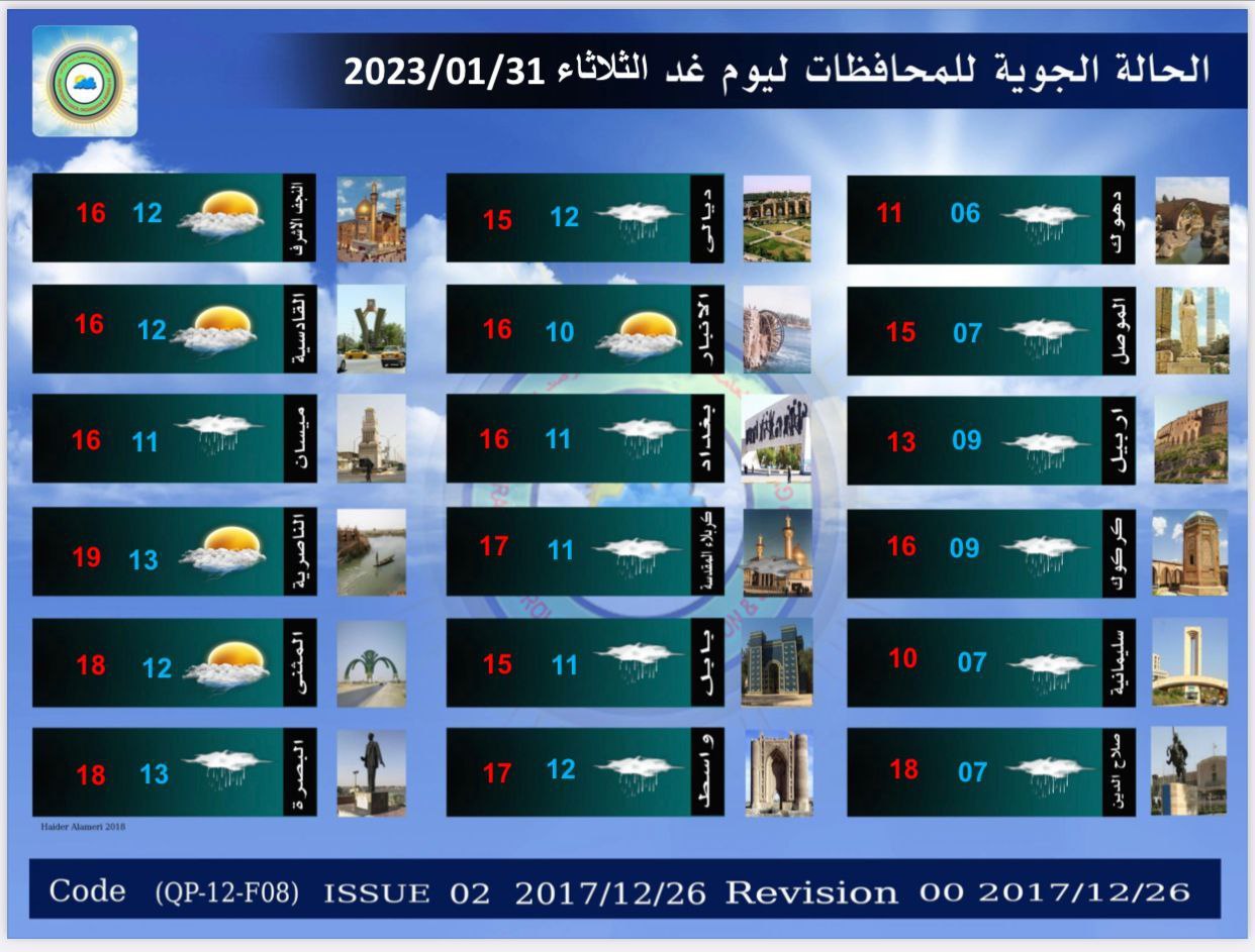 أعلنت هيئة الأنواء الجوية، اليوم الاثنين، عن حالة الطقس في البلاد للأسبوع الحالي، فيما توقعت استمرار تساقط الأمطار وانخفاضاً في درجات الحرارة.