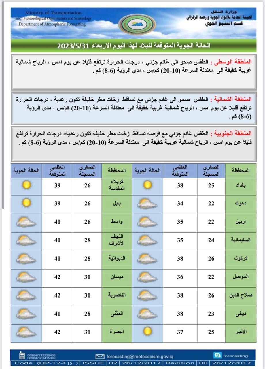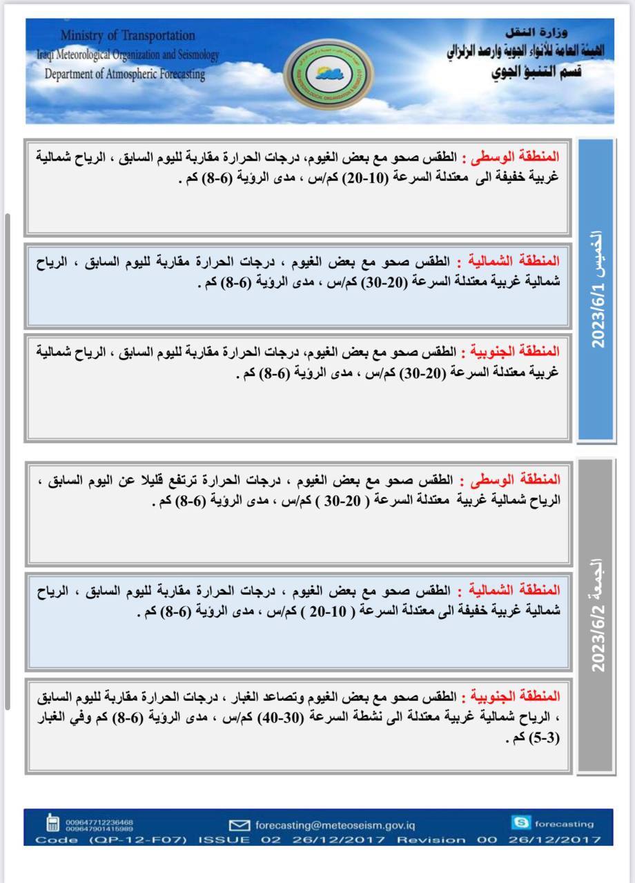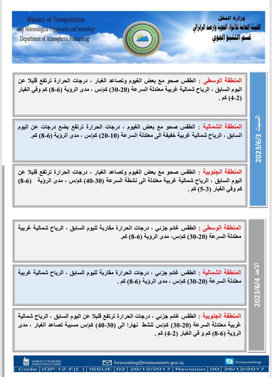 وبين أن “طقس البلاد ليوم الأحد المقبل سيكون غائماً جزئياً في جميع مناطق البلاد، والرياح شمالية غربية معتدلة السرعة (20-30) كم/س تنشط نهاراً في المنطقة الجنوبية إلى (30-40) كم/س مسببة تصاعد الغبار فيها، أما درجات الحرارة فستكون مقاربة لليوم السابق في الأقسام الوسطى والشمالية ، وترتفع قليلاً عن اليوم السابق في القسم الجنوبي من البلاد”.