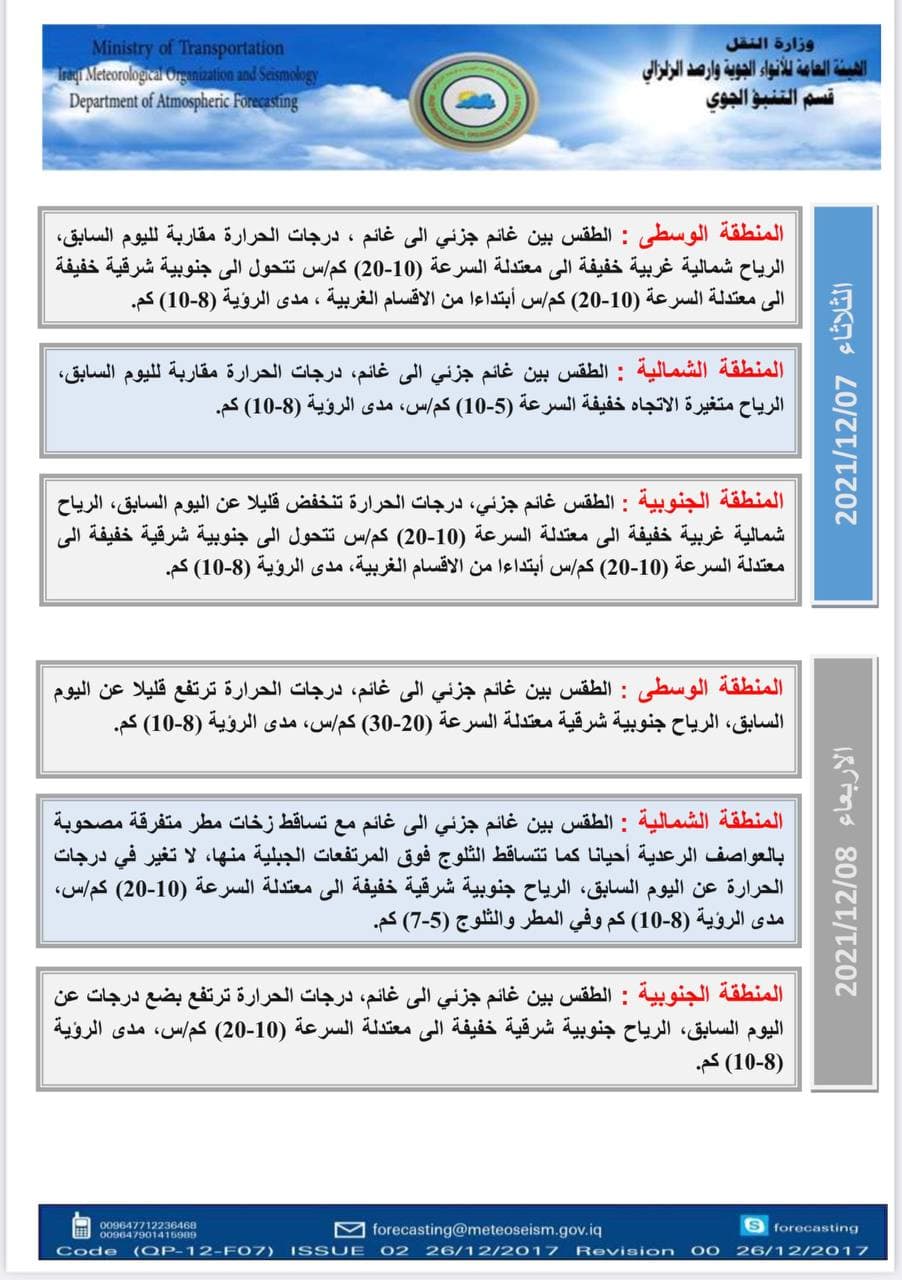 وأوضح أن “طقس يوم الأربعاء سيكون بين غائم الى غائم جزئي في المناطق الوسطى والجنوبية، وسيكون غائماً جزئياً الى غائم مع تساقط زخات مطر متفرقة مصحوبة بالعواصف الرعدية أحياناً كما تتساقط الثلوج في المرتفعات الجبلية منها في المناطق الشمالية، وسترتفع درجات الحرارة قليلا في المنطقتين الوسطى والجنوبية ،بينما ستبقى درجات الحرارة ذاتها في المنطقة الشمالية”.