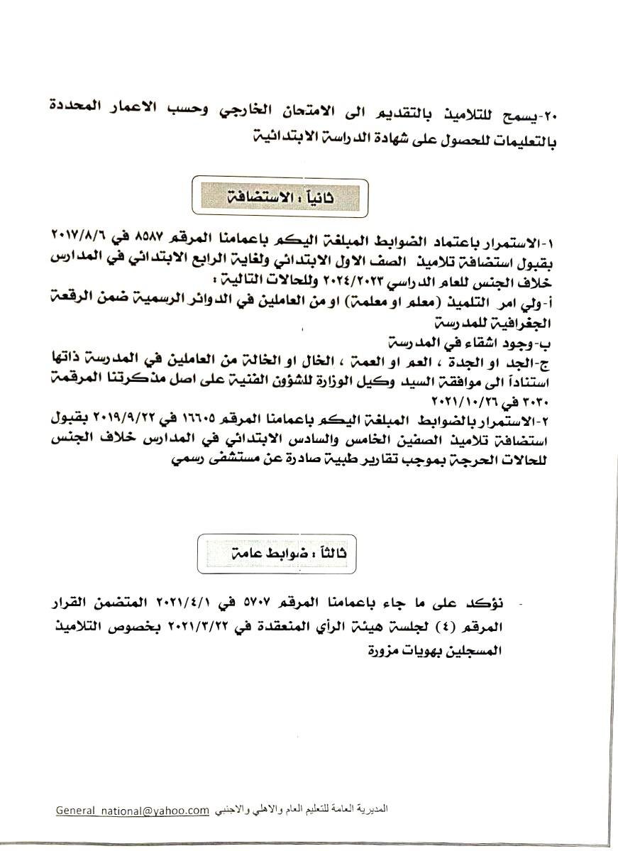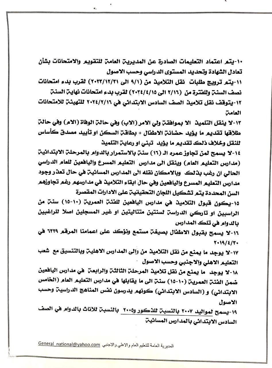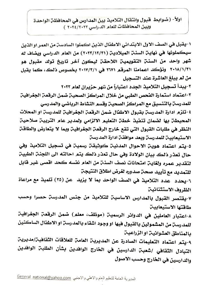وذكر بيان للوزارة، تلقت “النعيم نيوز” نسخة منه، أنها “حددت ضوابط قبول وإنتقال التلاميذ داخل المحافظة الواحدة وبين المحافظات للعام الدراسي 2023-2024 وحسب التعليمات والفقرات المدرجة في الكتاب أدناه: