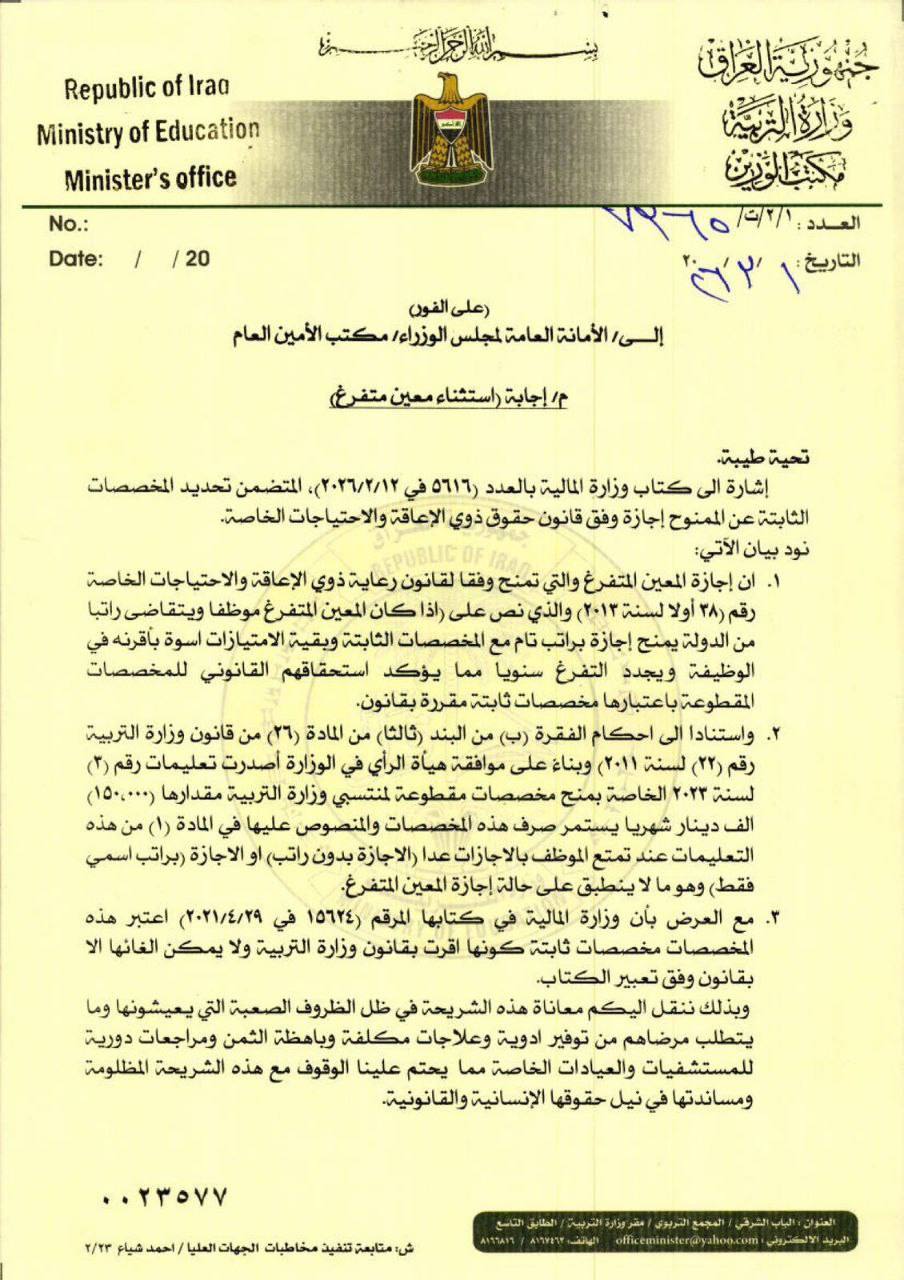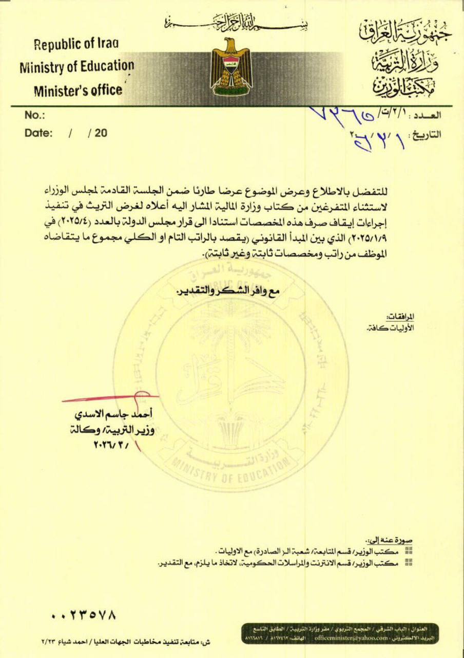 خاطب وزير التربية وكالة أحمد الأسدي، الأمانة العامة لمجلس الوزراء لاستثناء المعين المتفرغ من إيقاف المخصصات الثابتة.