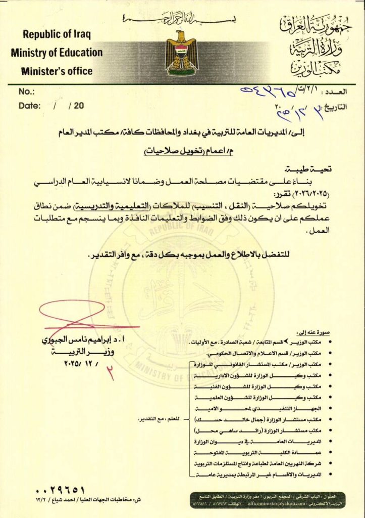 قرر وزير التربية، إبراهيم نامس الجبوري، اليوم الأربعاء، منح صلاحية النقل والتنسيب للملاكات التعليمية والتدريسية إلى المديرين العامين.