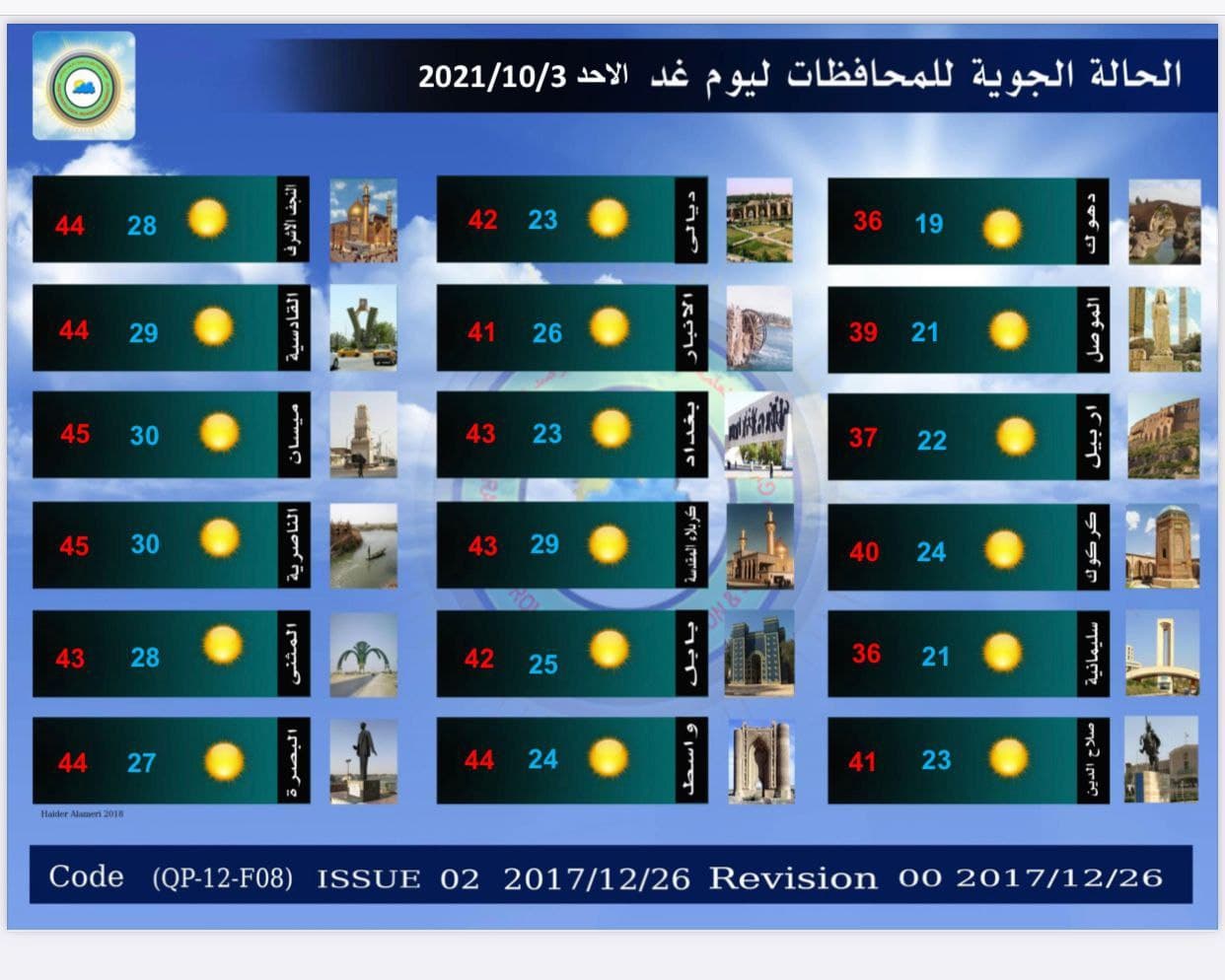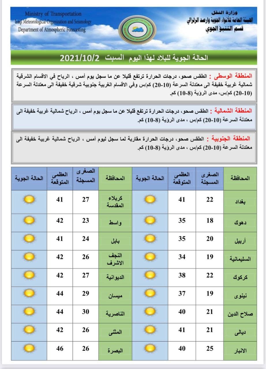 وذكر بيان للهيئة، تلقت “النعيم نيوز” نسخة منه،  أن “طقس يوم غد الأحد صحو في المناطق الوسطى. والجنوبية، في حين سيكون الطقس صحواً مصاحباً لبعض الغيوم في المناطق الشمالية من البلاد، أما درجات الحرارة فسترتفع. قليلاً في المناطق الشمالية والوسطى، فيما ستكون درجات الحرارة في المنطقة الجنوبية مقاربة لليوم السابق. و ستتخطى درجات الحرارة الـ 40 درجة في  14 محافظة”.