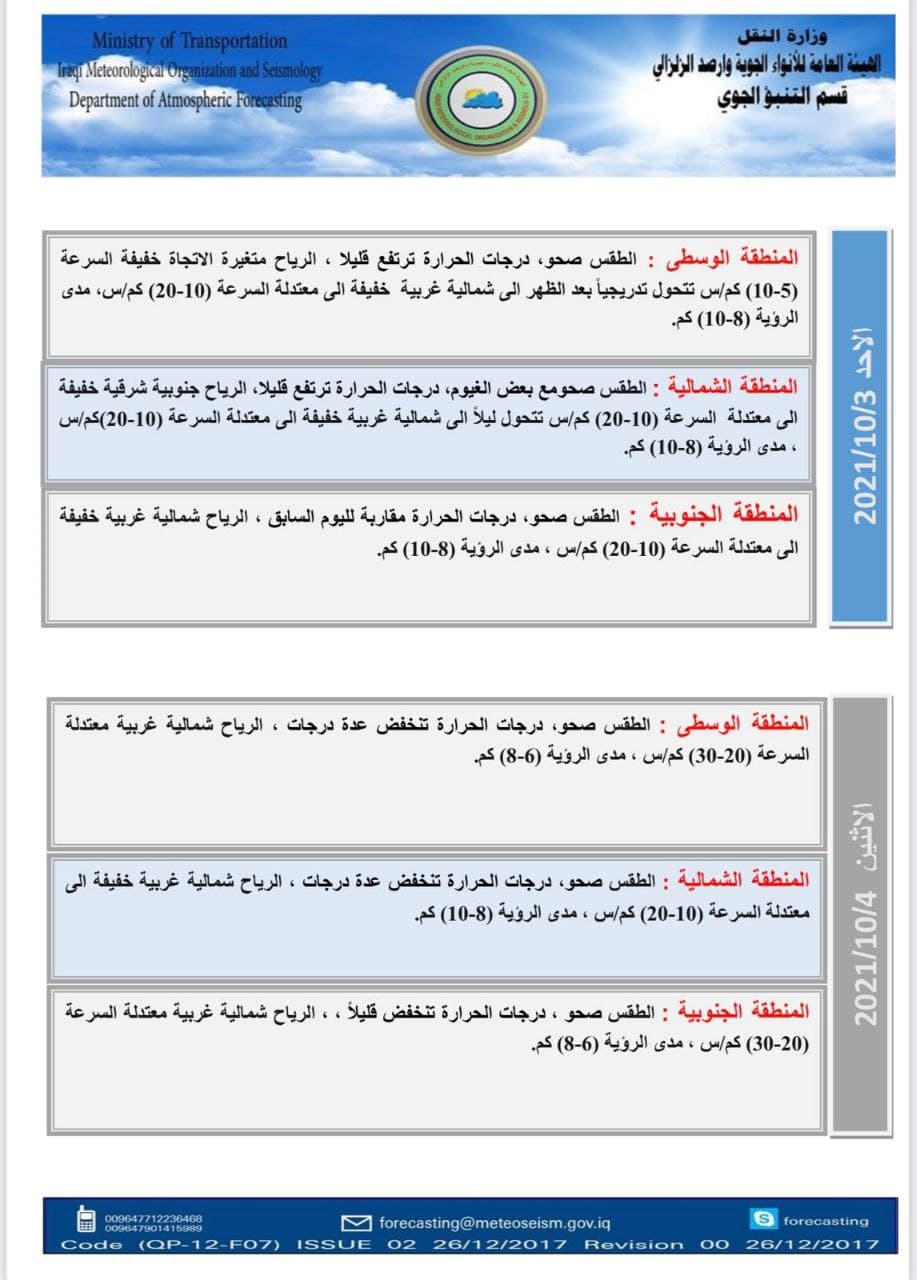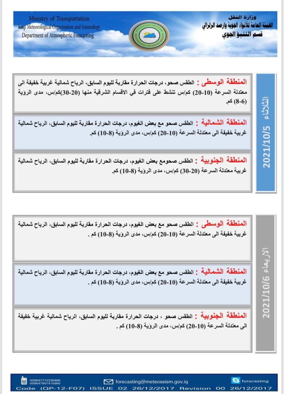 ولفت إلى أن “يوم الأربعاء سيكون الطقس صحواً مصاحباً مع بعض الغيوم في المناطق الوسطى والشمالية، بينما سيكون الطقس صحواً في المنطقة الجنوبية، أما درجات الحرارة ستكون مقاربة لليوم السابق في عموم مناطق البلاد”.